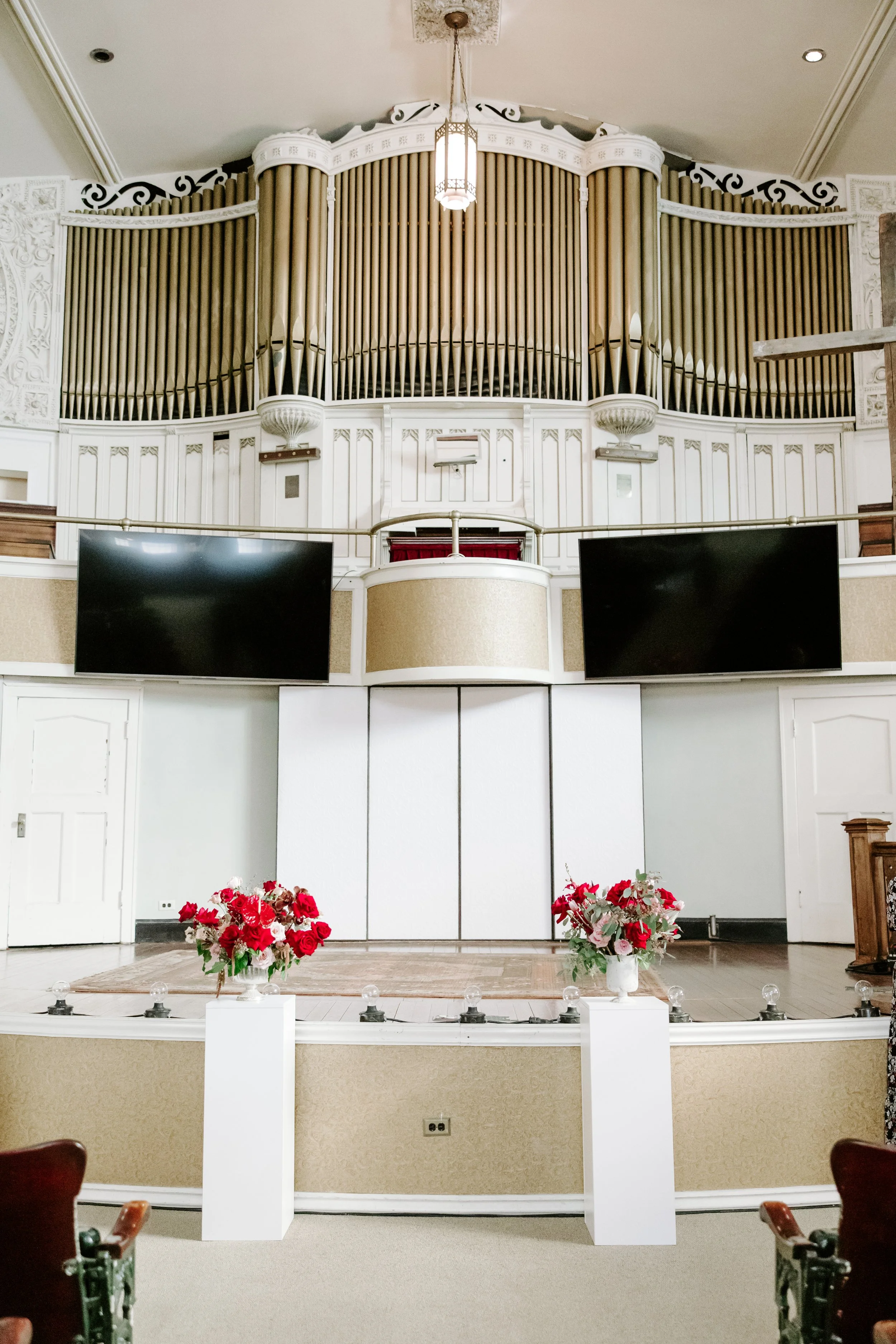 Two lush, mismatched burgundy pedestal arrangements framed the church ceremony, designed with enough structure and versatility to transition seamlessly into the evening celebration. Following the ceremony, these statement pieces were repurposed at the Logan Square residence—bringing continuity, scale, and floral impact to the more intimate setting.