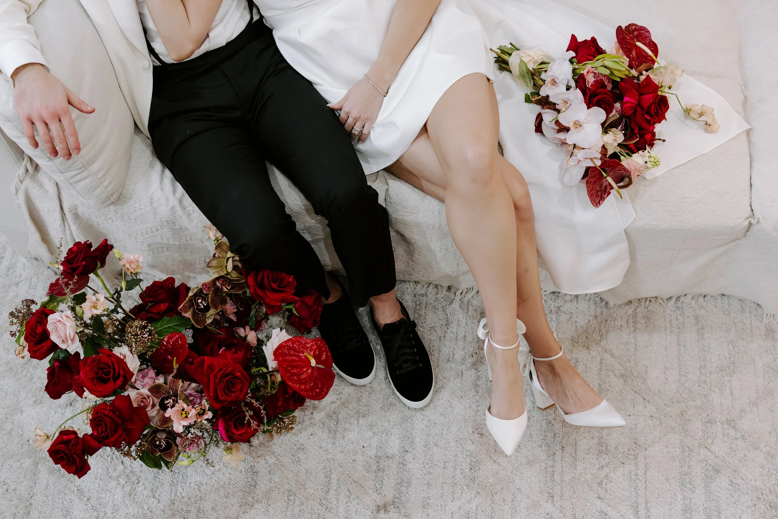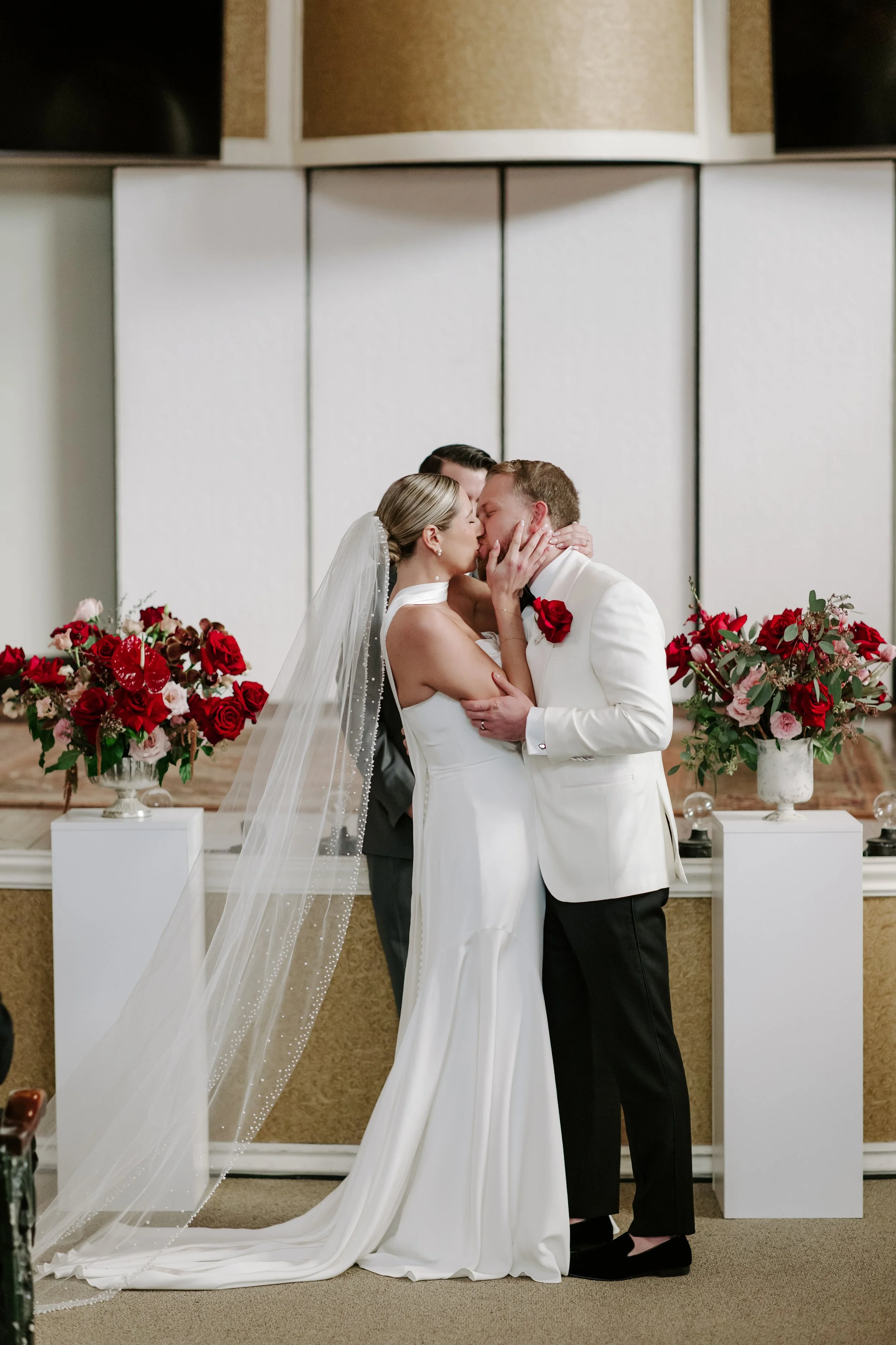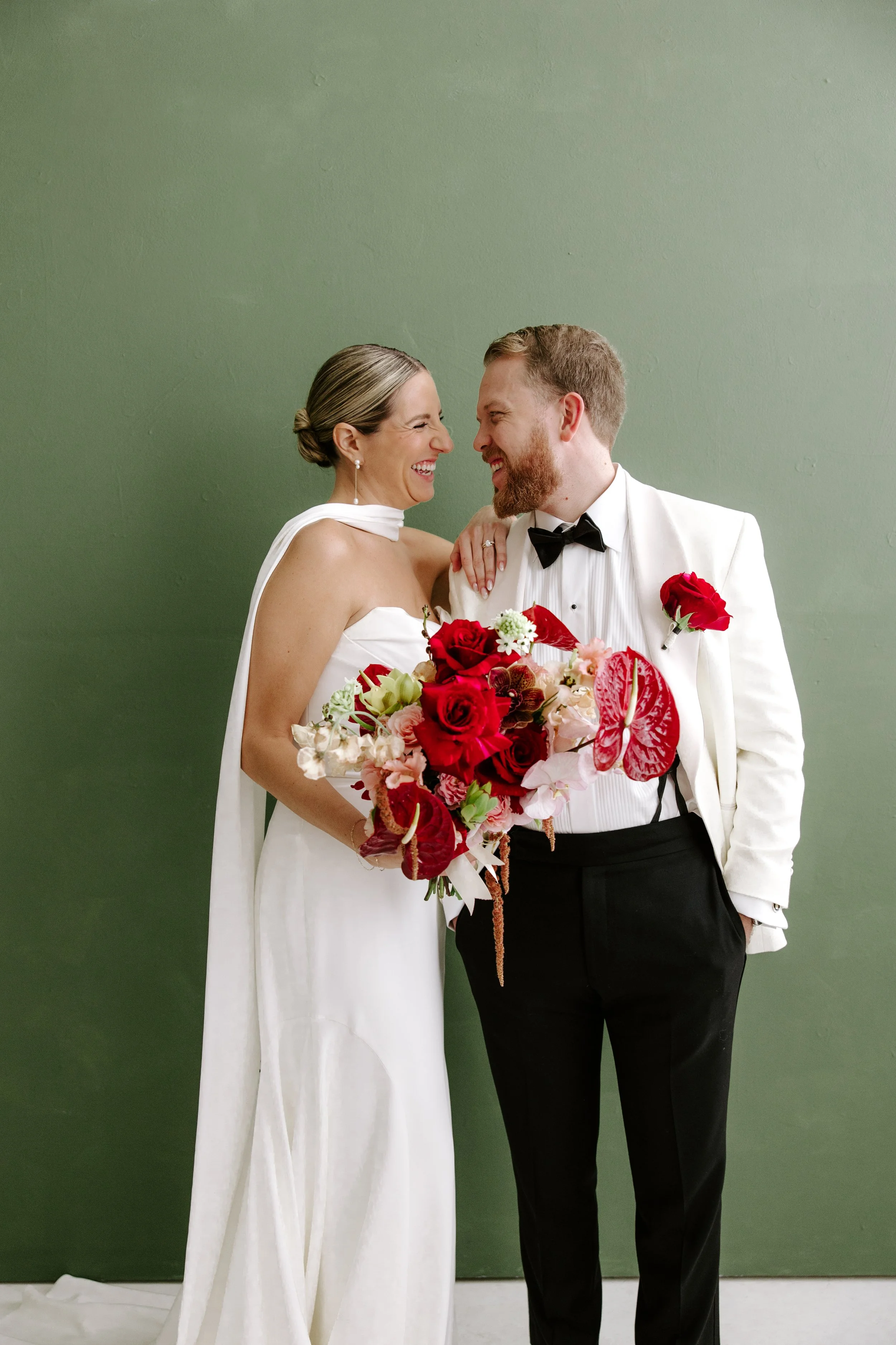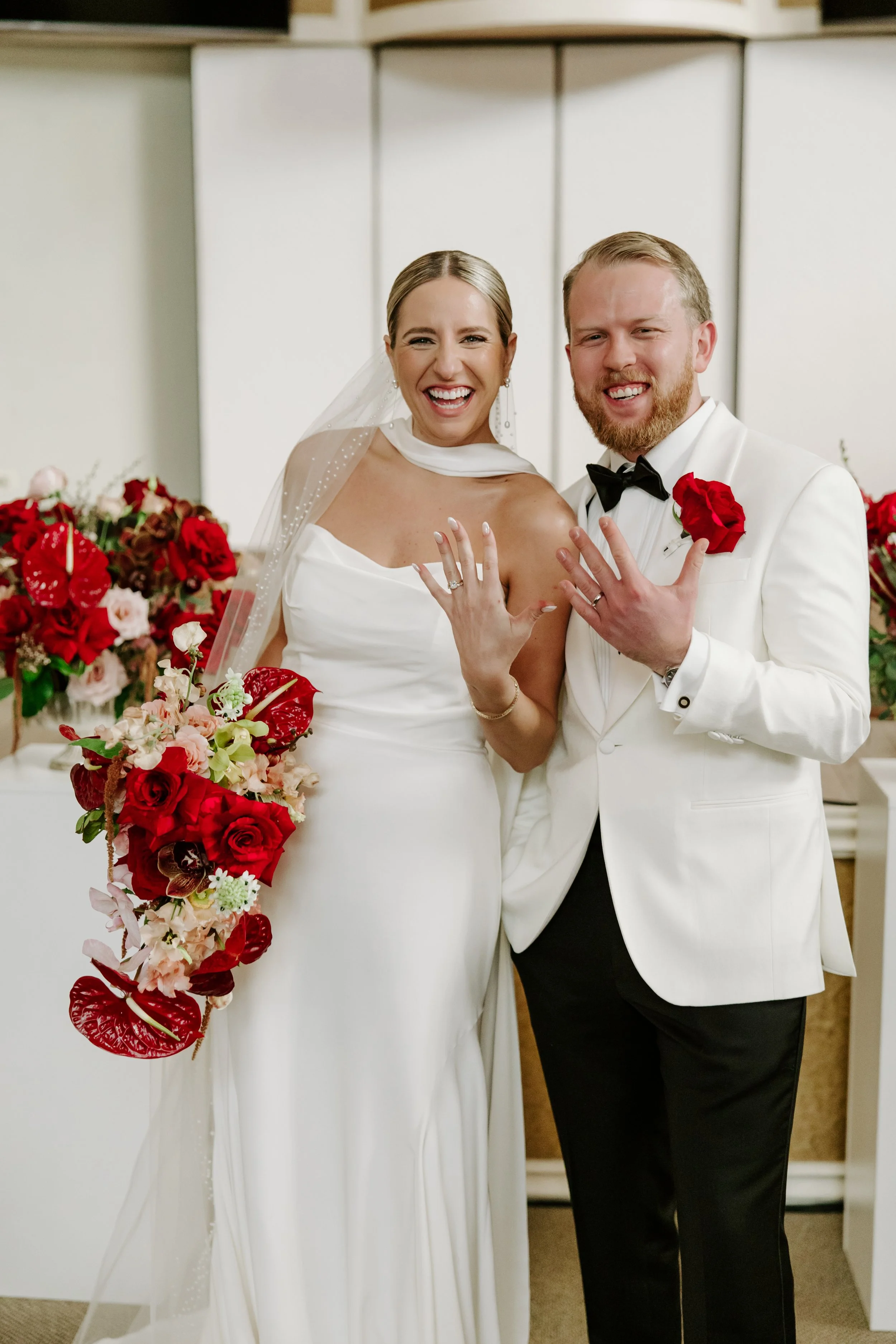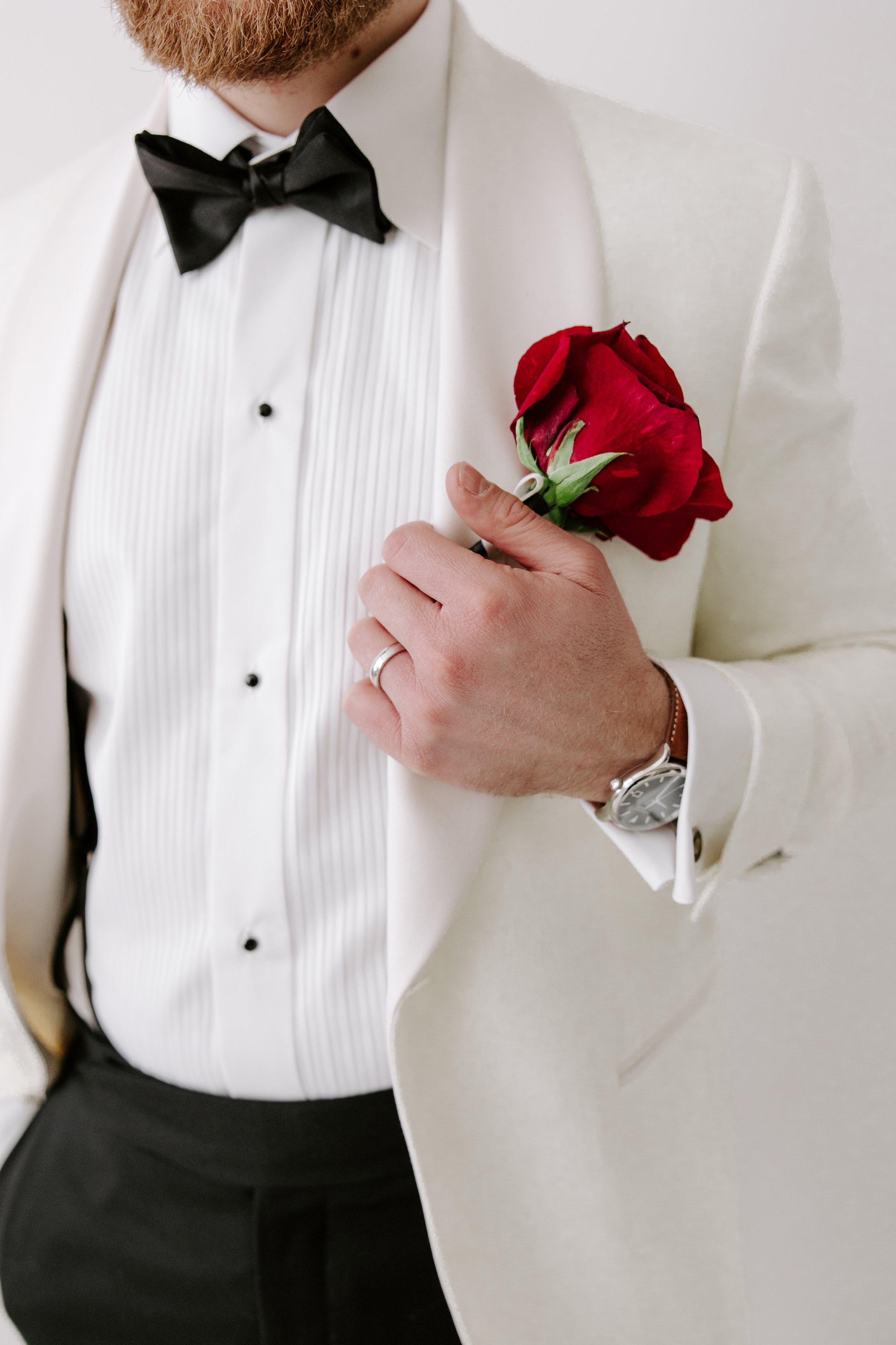 Sean wore a coordinating red panther rose boutonniere, a bold and intentional detail that mirrored the strength of Jillian’s bouquet while keeping the look clean and modern.