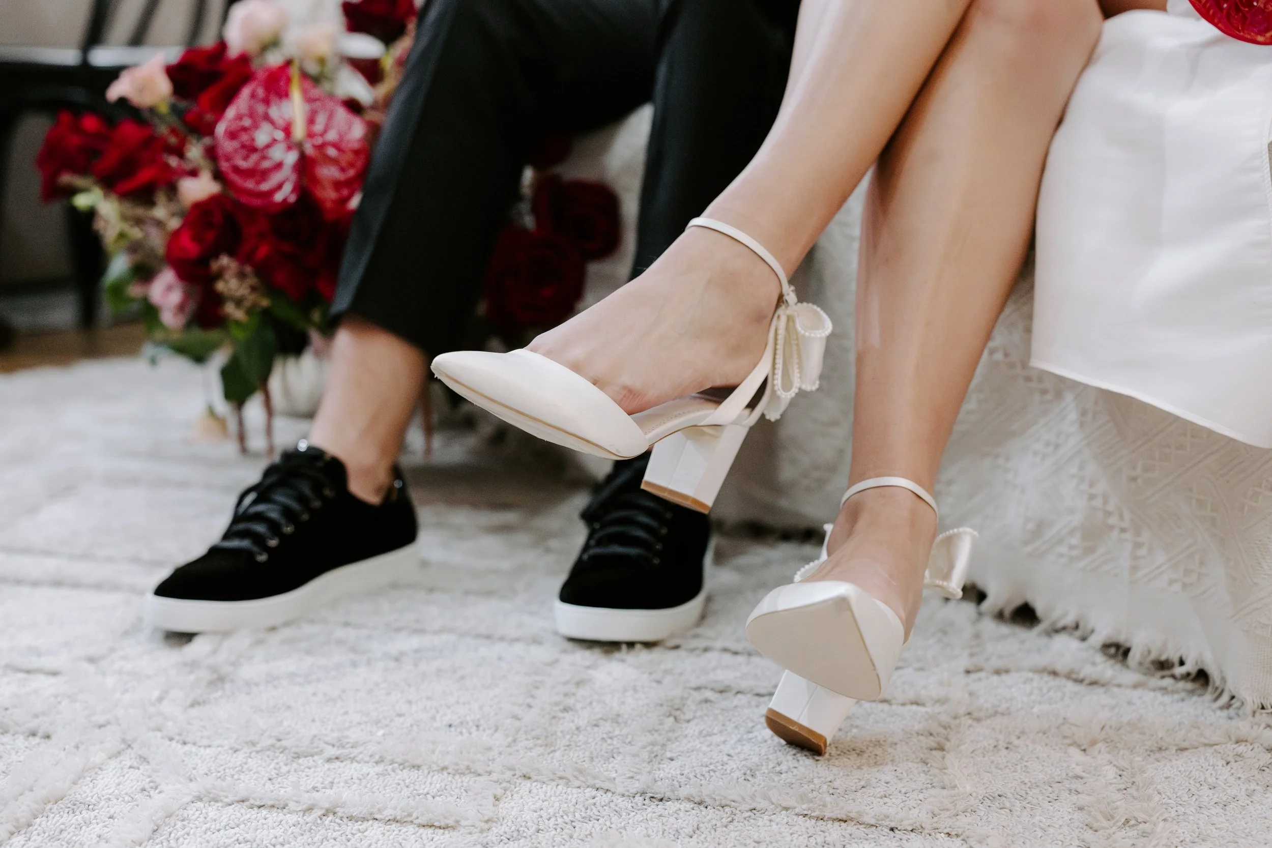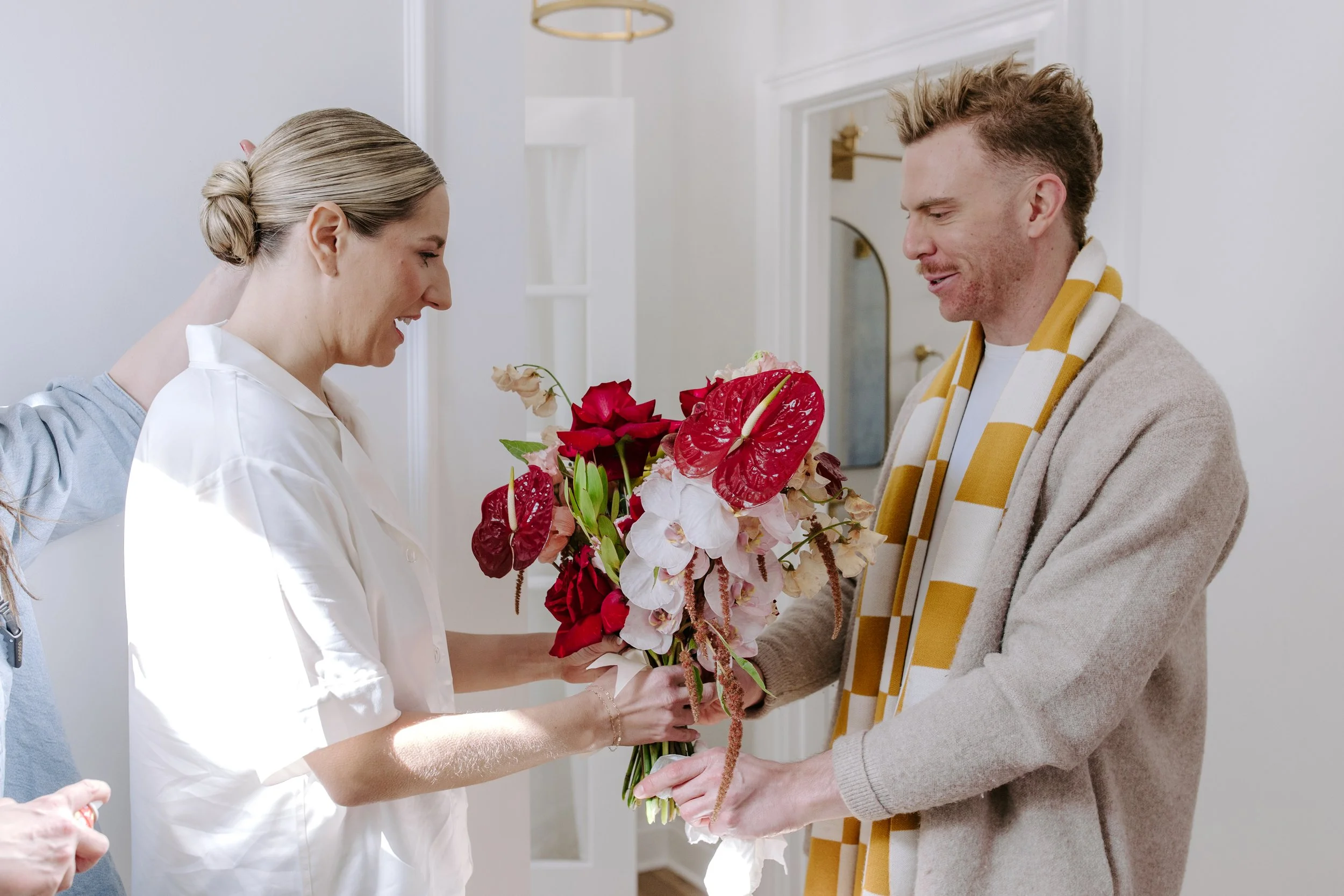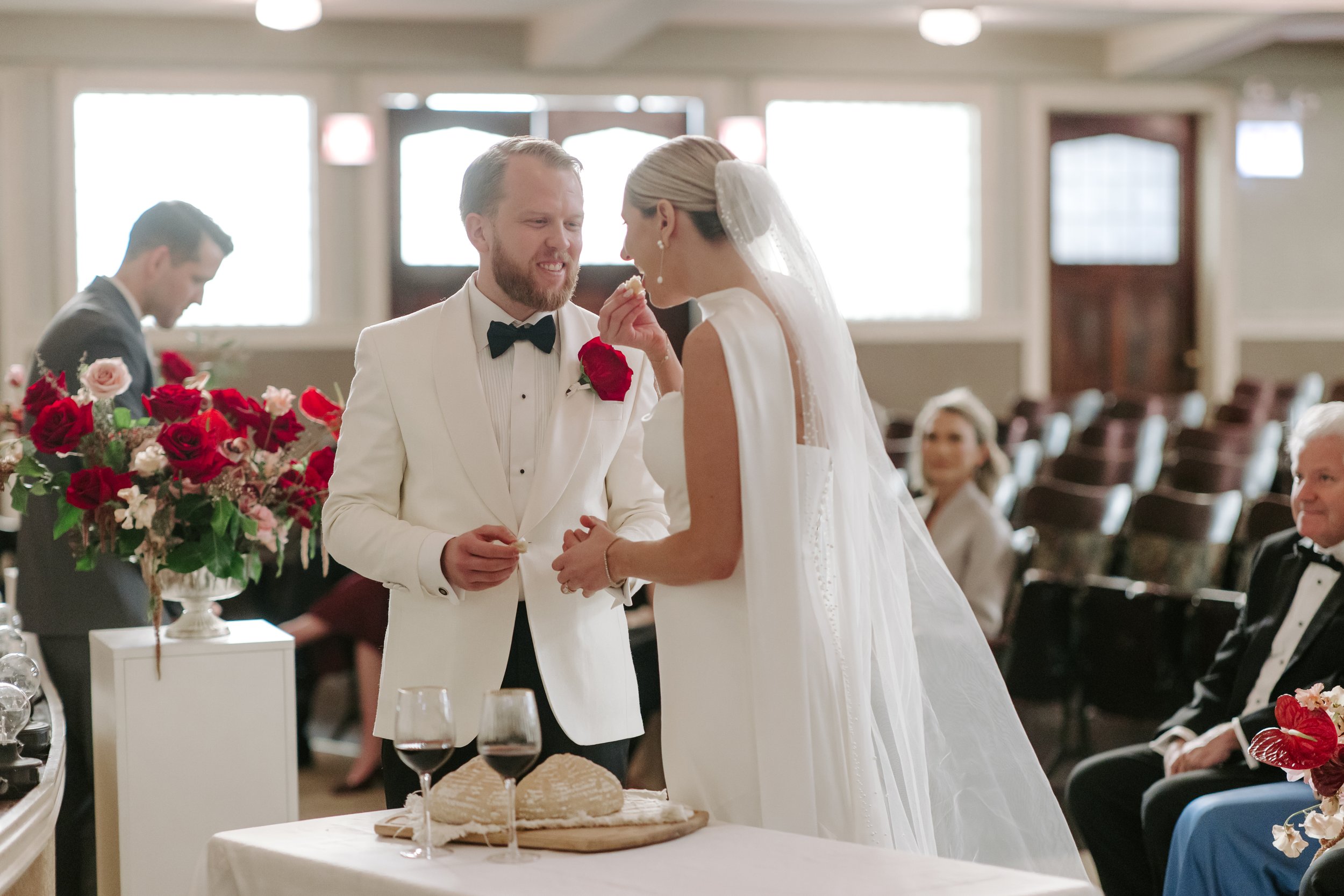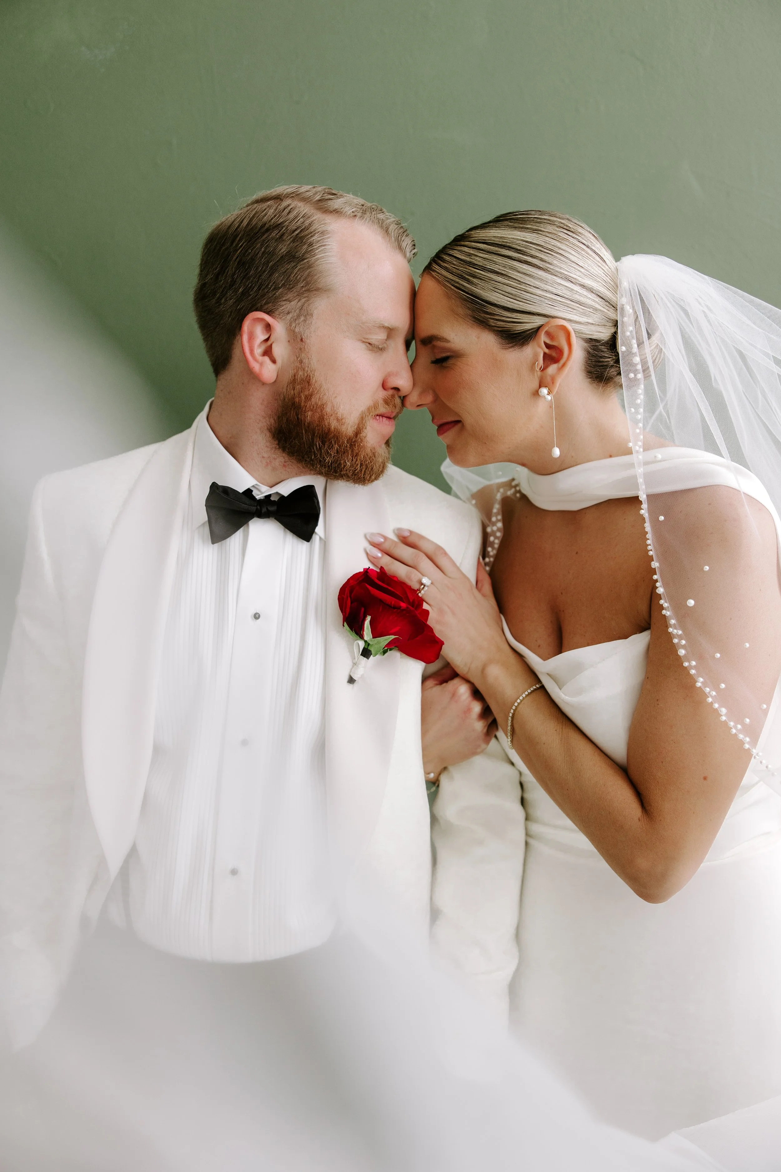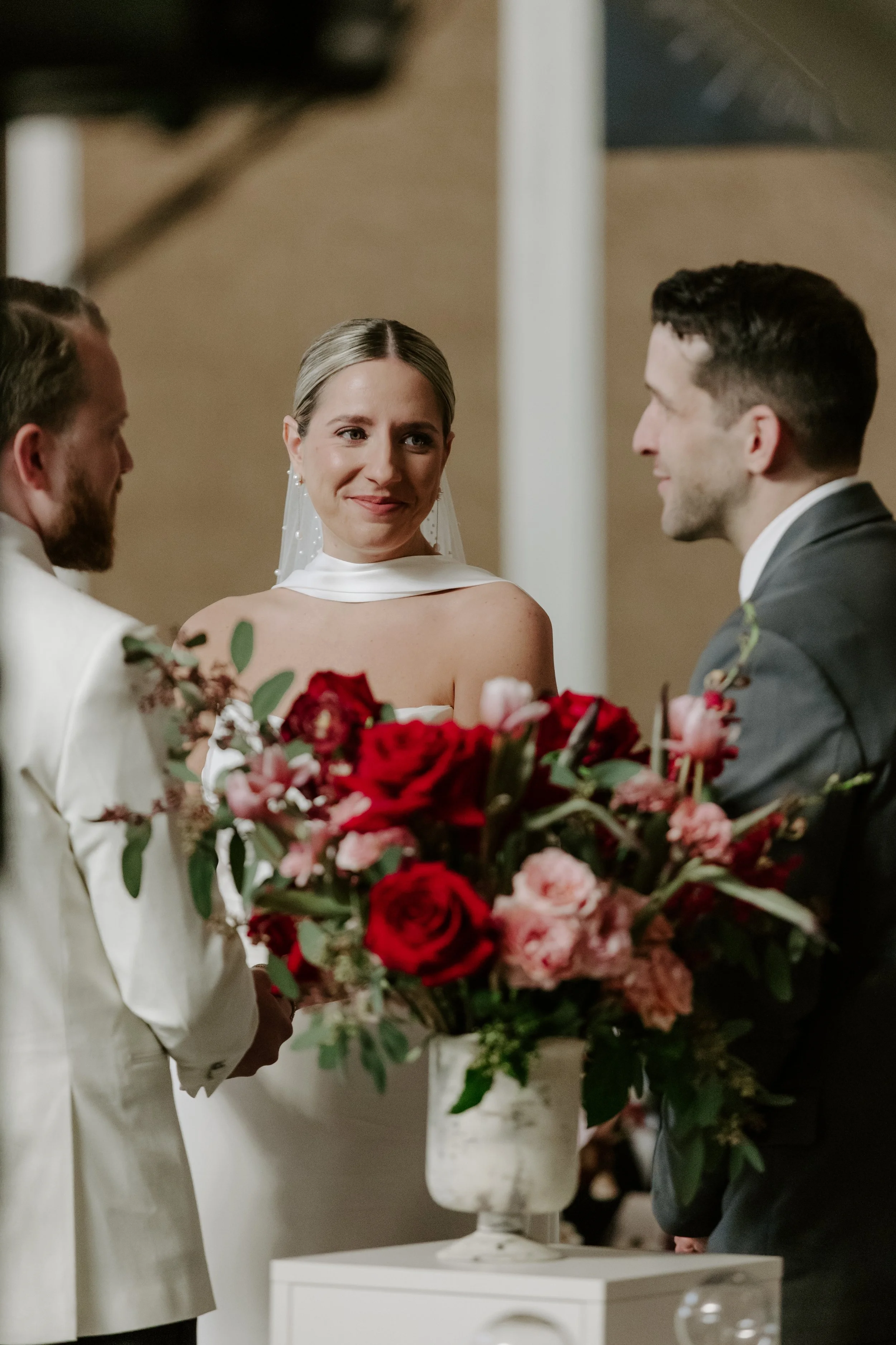 Sean wore a coordinating red panther rose boutonniere, a bold and intentional detail that mirrored the strength of Jillian’s bouquet while keeping the look clean and modern.