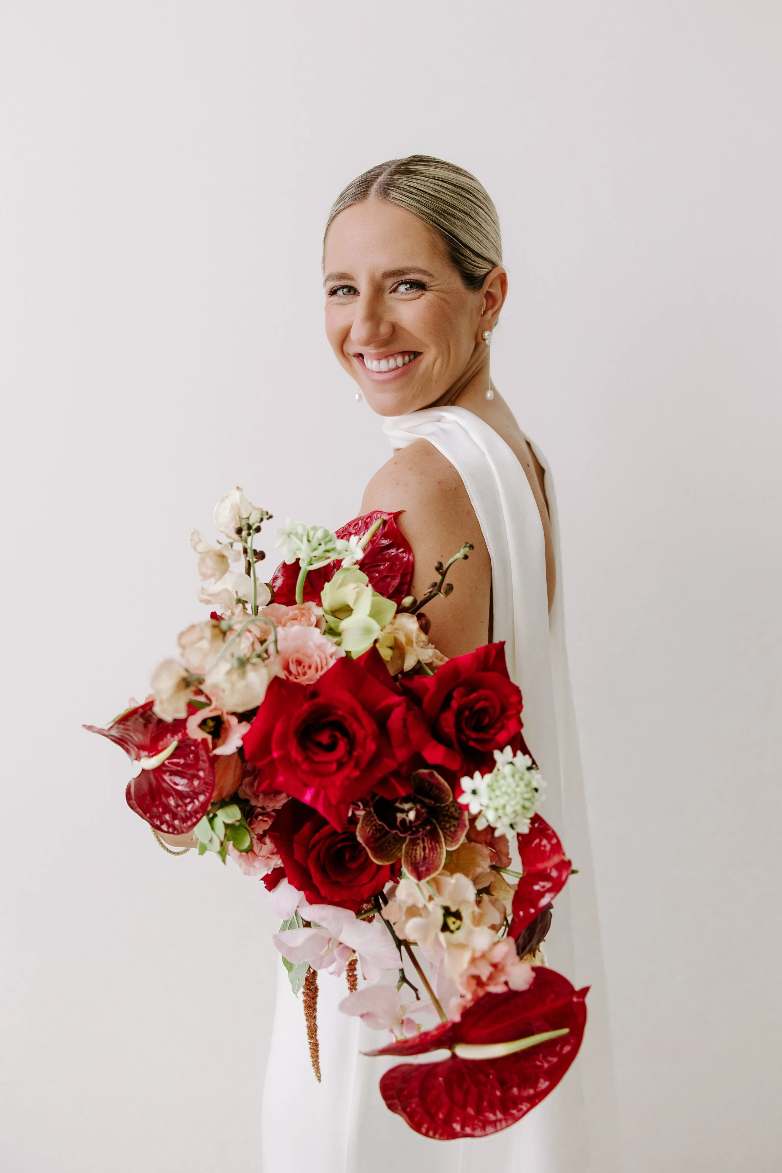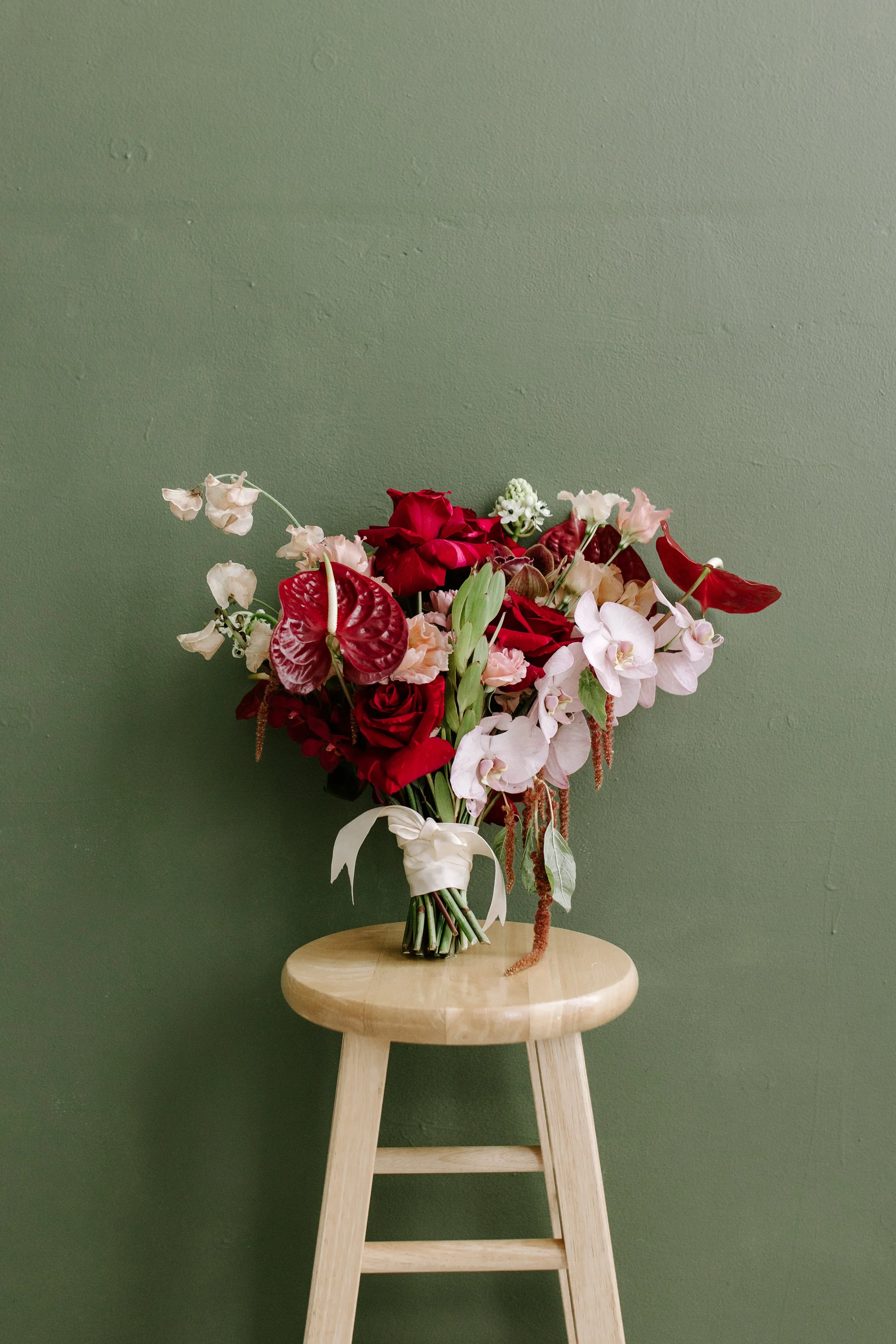 Jillian carried a bold, sculptural bridal bouquet designed to feel dramatic, editorial, and modern. Color-blocked and layered, the bouquet centered around deep red panther roses as its focal point, paired with burgundy anthurium, lime green lucadendron, dancing sweet peas, and fluffy lisianthus for depth and romance.