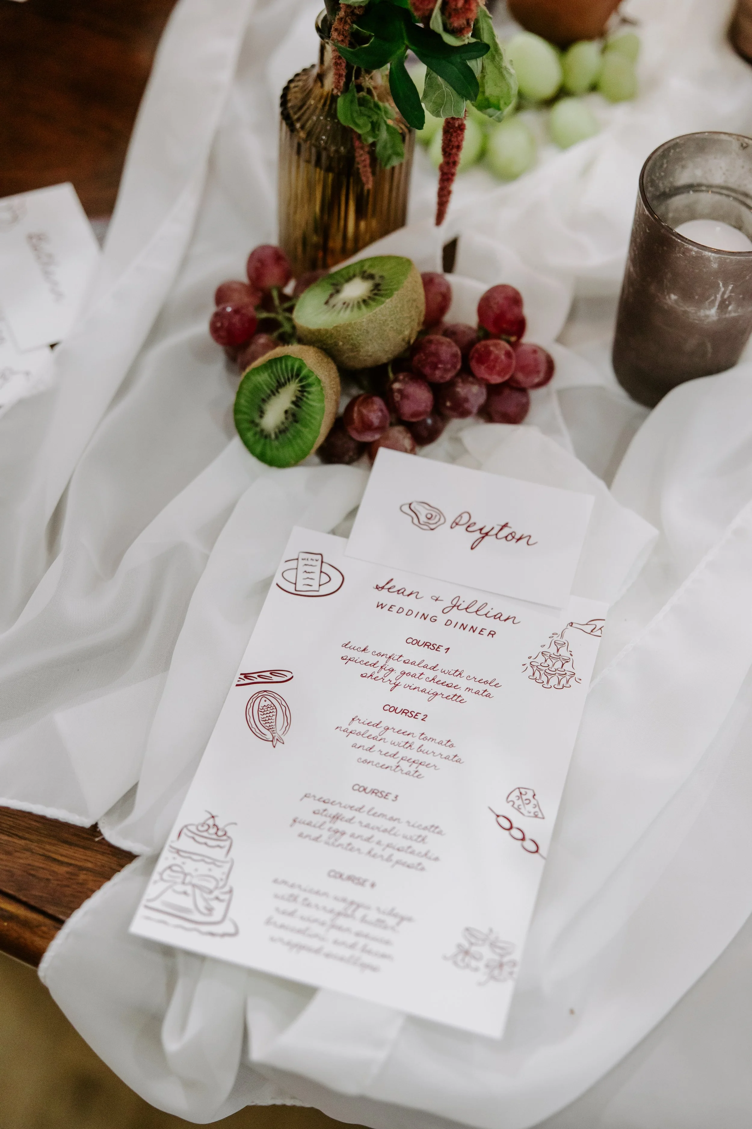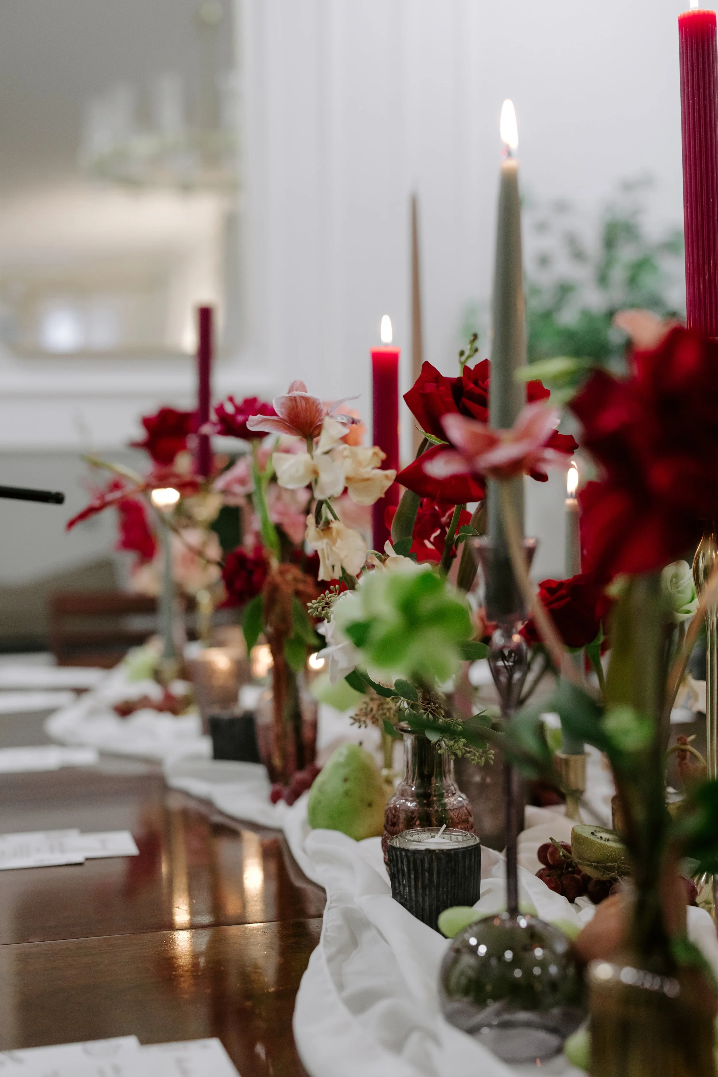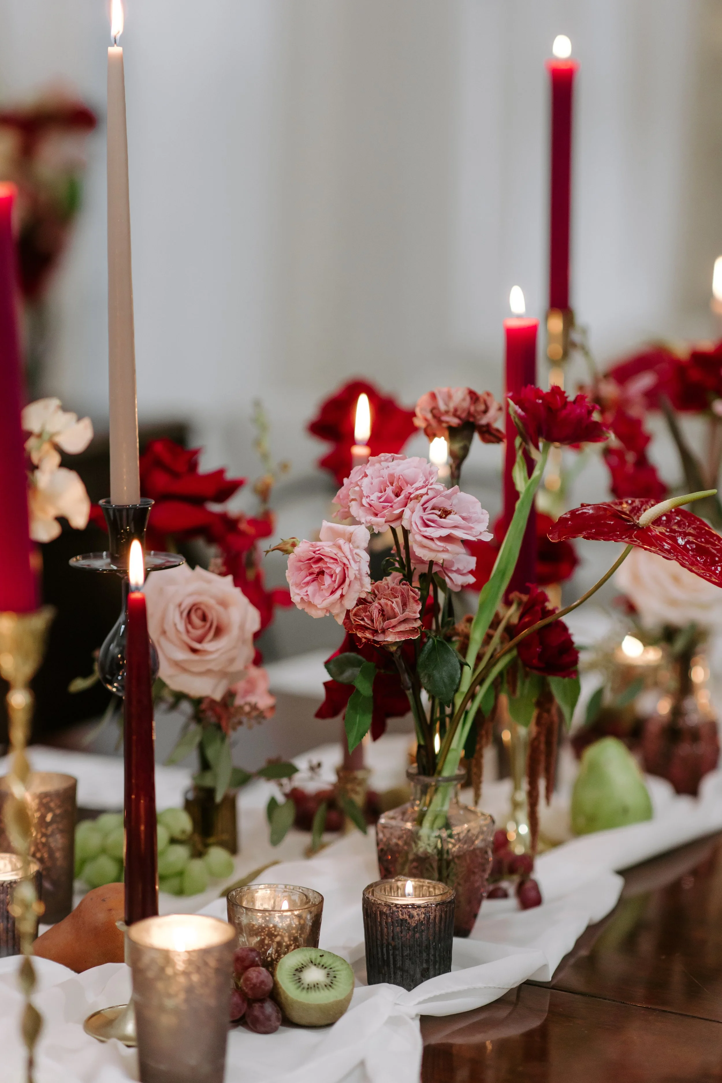 Bronze votive candles in varying heights added depth and warmth, while scattered kiwis and grapes introduced an organic, almost still-life element—playful and classic all at once.