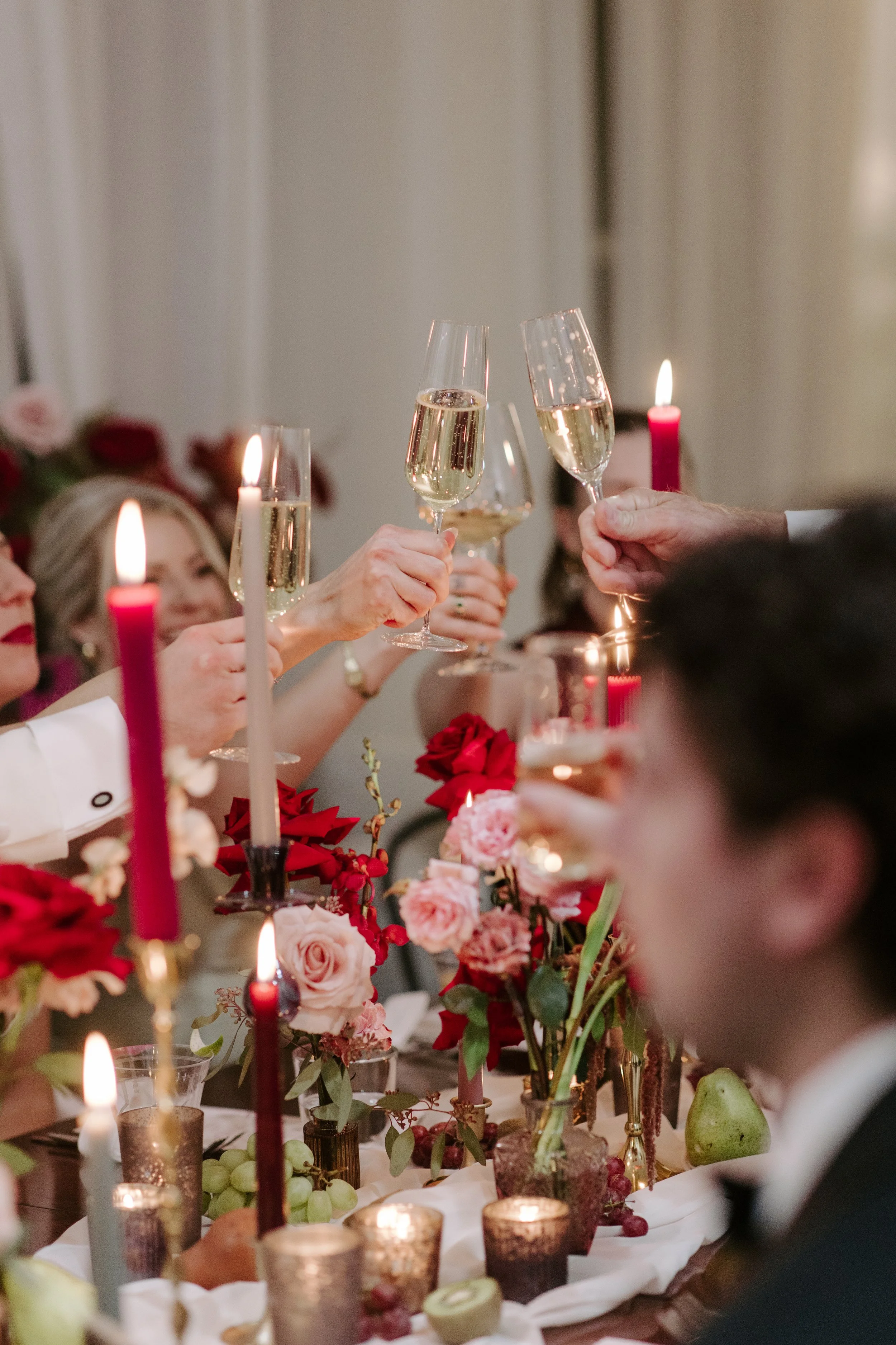 From bold red florals and cascading orchids to candlelit tables and sculptural textures, every element worked together to create a winter wedding that felt warm and elevated. Saville Flowers was honored to help bring this layered, intimate vision to life—one filled with beauty and intention.